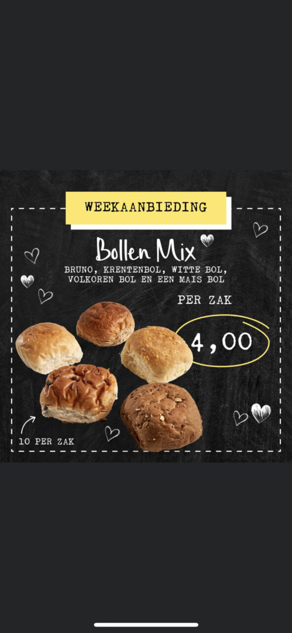 10 bollen per zak. Bruno,krentenbol,witte bol,volkoren bol en een mais bol.